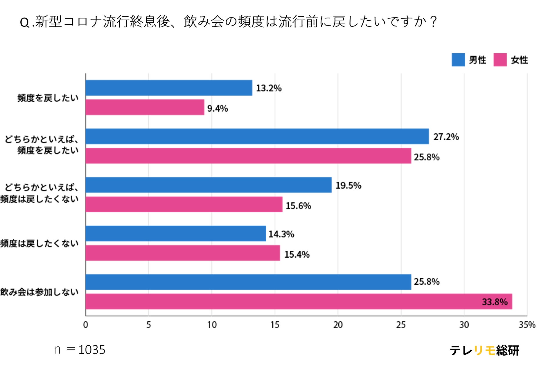 その結果、元々飲み会に参加しないという人達も含めて6割以上がコロナ渦が収束しても飲み会の頻度を流行前の様には戻したくないと消極的な反応を見せています